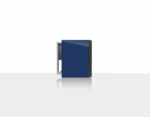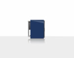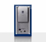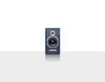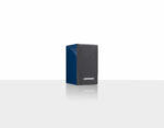 - Compact sealed cabinet finished in high-gloss blue with leather upholstered baffle
